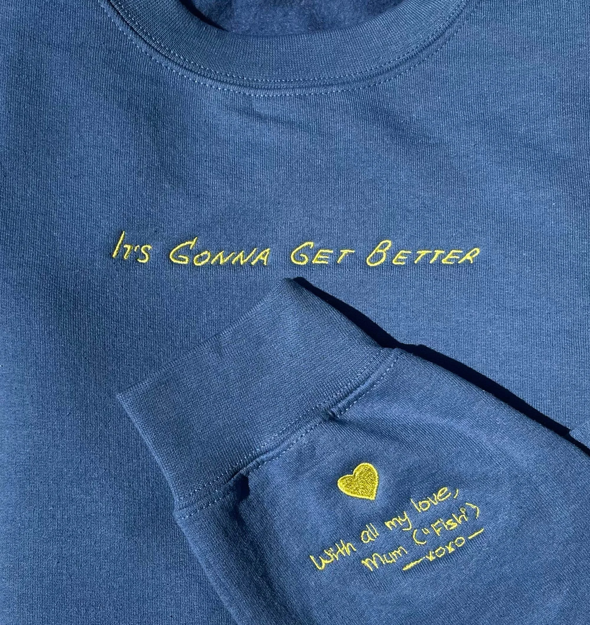 I took his handwriting and was able to digitize it and have it embroidered across the chest of each sweatshirt; on one sleeve of every shirt I added a small yellow heart which is the universal symbol for all the lives lost to COVID-19. "It's Gonna Get Better" is a simple phrase that reminds me of my father's joy and optimism, and I hope it brings as much comfort to others as it has to me.