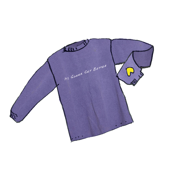 The inspiration for 'It's Gonna Get Better' came from one of our favorite songs by the band Genesis. Discovering an old cassette tape with the song written in my father's handwriting was a poignant moment. Realizing the universal message it held for those navigating difficult times, I decided to digitize his handwriting and have it embroidered across the chest of each sweatshirt. Additionally, a small yellow heart, representing all lives lost to COVID-19, is on the sleeve of each sweatshirt.