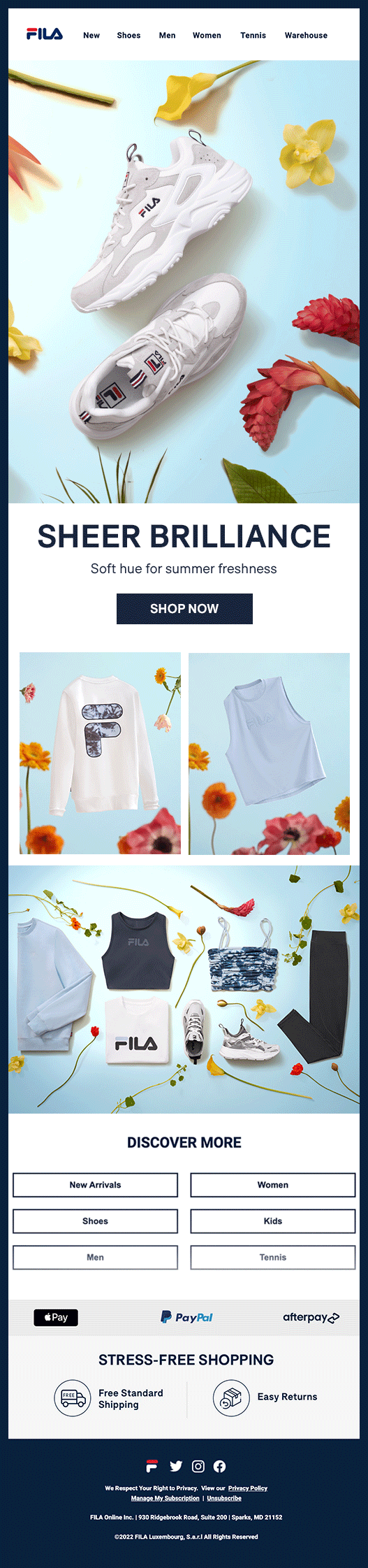 Highlight key products from the Sheer Brilliance Collection, embodying a sense of 'lightness' and 'airiness' that seamlessly aligns with FILA's brand identity.